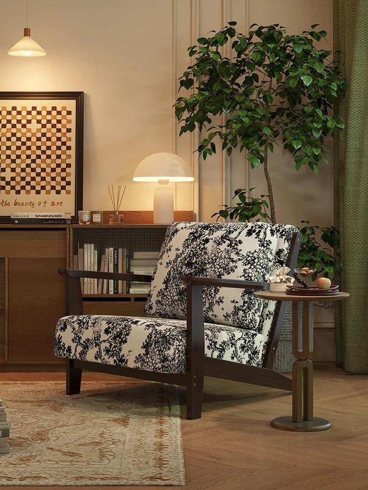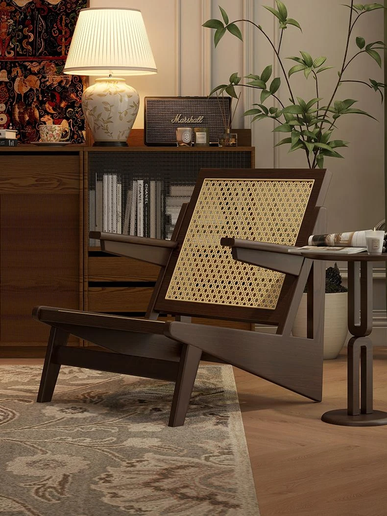 Vintage-Inspired Single Sofa Chair – Solid Wood Rattan Kangaroo Lounger for Balcony Leisure – Black Walnut Wabi-Sabi Living Room Furniture