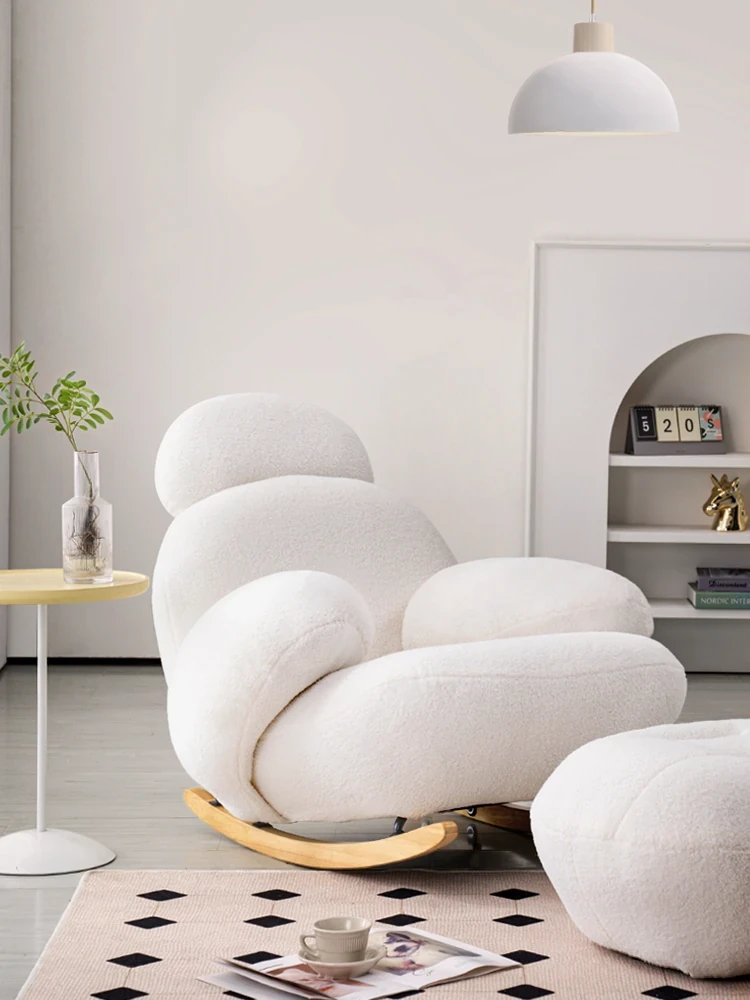 シンプルでスタイリッシュな「大白ロッキングチェア」—現代的なリビングやベッドルームに最適!バルコニーでもリラックスできる一人用のソファ。快適さとデザインを兼ね備えた、あなたの理想の休息空間を演出!